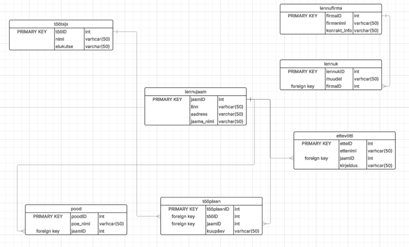 töötaja. Kuna üks töötaja võib töötada erinevates lennujaamades ja lennujaamas on palju töötajaid, on nende seos lahendatud vahetabelitööplaankaudu. See seob omavahel töötaja ID, lennujaama ID ja tööpäeva (kuupäev).