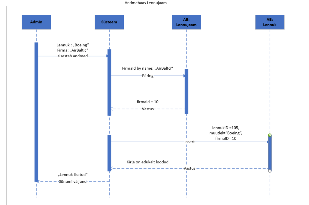 • Sõnumid (Sõnumid): Suhtlust näidatakse osalejate vaheliste horisontaalsete nooltega. Need võivad olla käsud, andmepäringud või tagastatud vastused.
